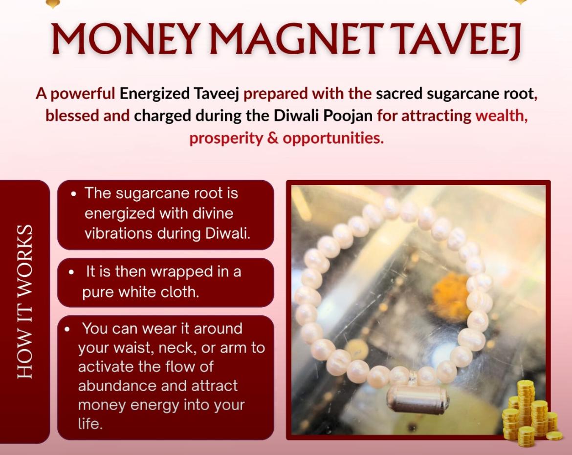 Money Magnet Taveej is a spiritually energized talisman prepared using sacred sugarcane root, traditionally blessed and charged during the auspicious Diwali Poojan. It is designed to symbolize abundance, prosperity, and positive financial flow.