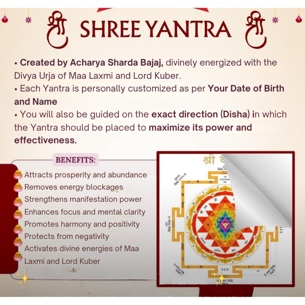Shree Yantra is one of the most powerful and sacred geometric symbols in Vedic tradition, representing the divine energy of Maa Laxmi (Goddess of Wealth) and Lord Kuber (God of Treasury). It is believed to be a cosmic diagram that attracts prosperity, success, harmony, and spiritual growth.